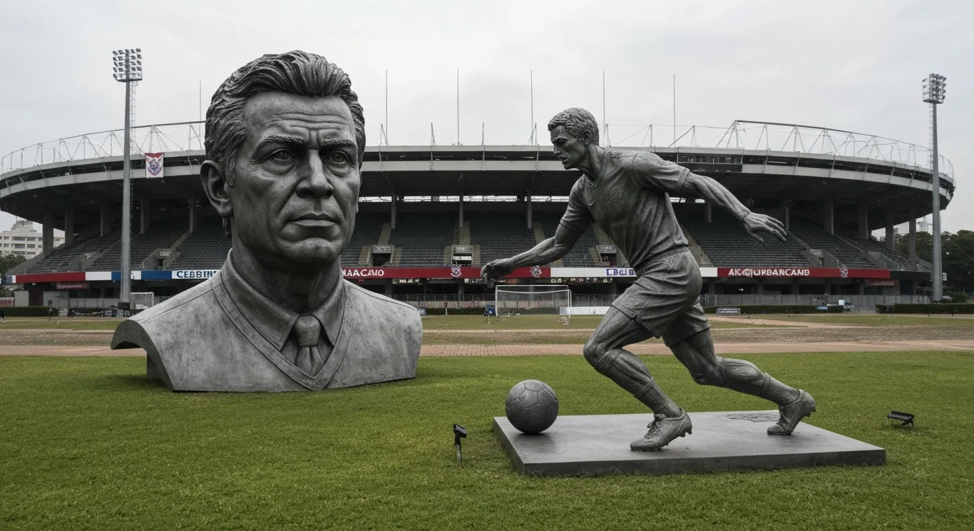 Estádio do Corinthians com estátua de Cássio segurando taça e Rivellino em movimento, destacando ídolos inesquecíveis Corinthians na jornada da torcida