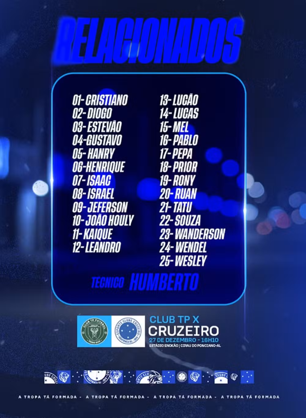 O confronto amistoso teve o Cruzeiro atuando com a seguinte escalação: Wendel; Souza, Isaac, Gustavo e Mel; Peppa, Henrique e Ruan; Hanry, Pablo e Leandro. Os gols da equipe foram marcados por Leandro, Rony e Lucão, enquanto Cleyton anotou o gol de honra do Club TP, que ainda desperdiçou um pênalti durante a partida.
