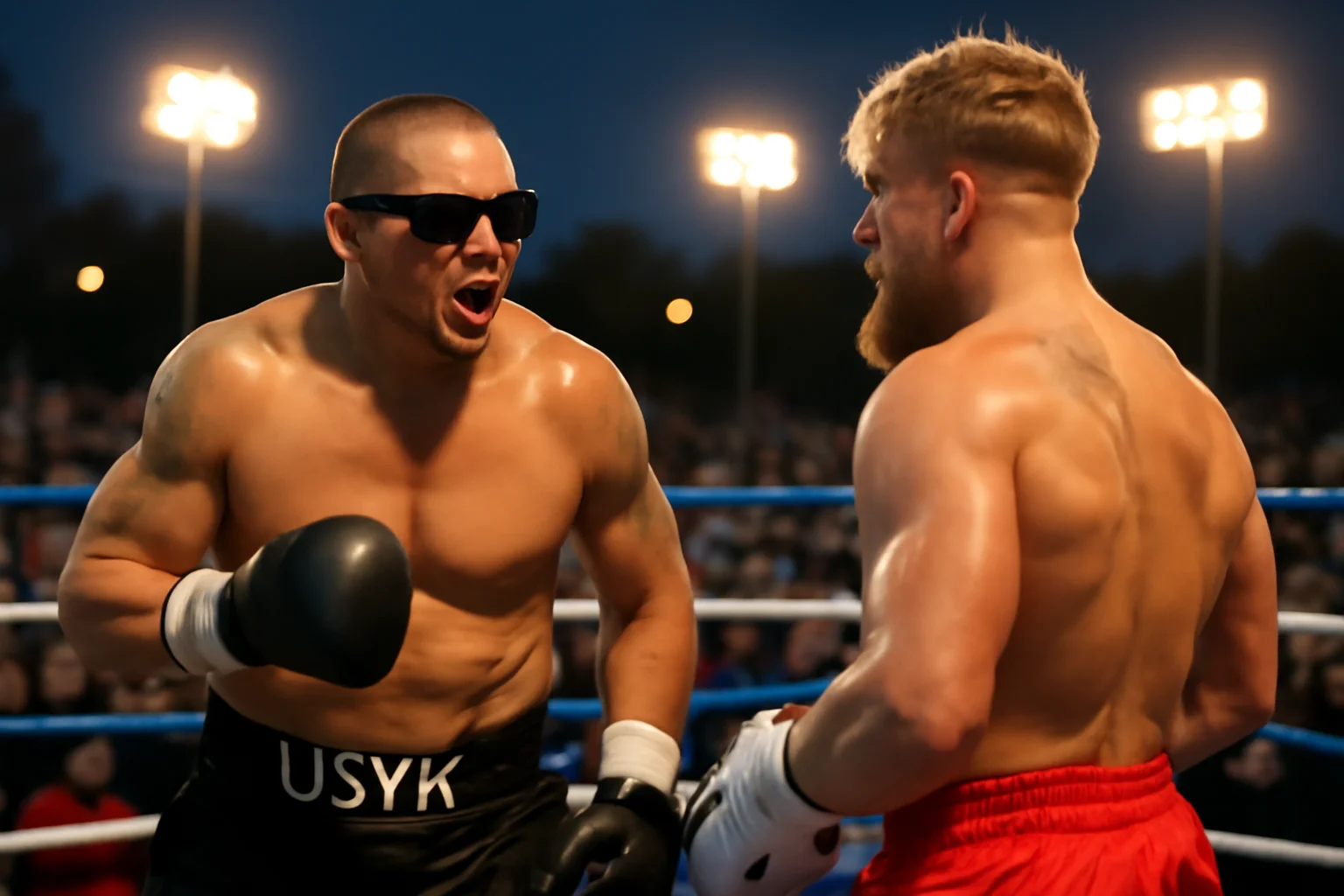 Cena de Oleksandr Usyk provocando Jake Paul em ringue ao ar livre com luzes intensas